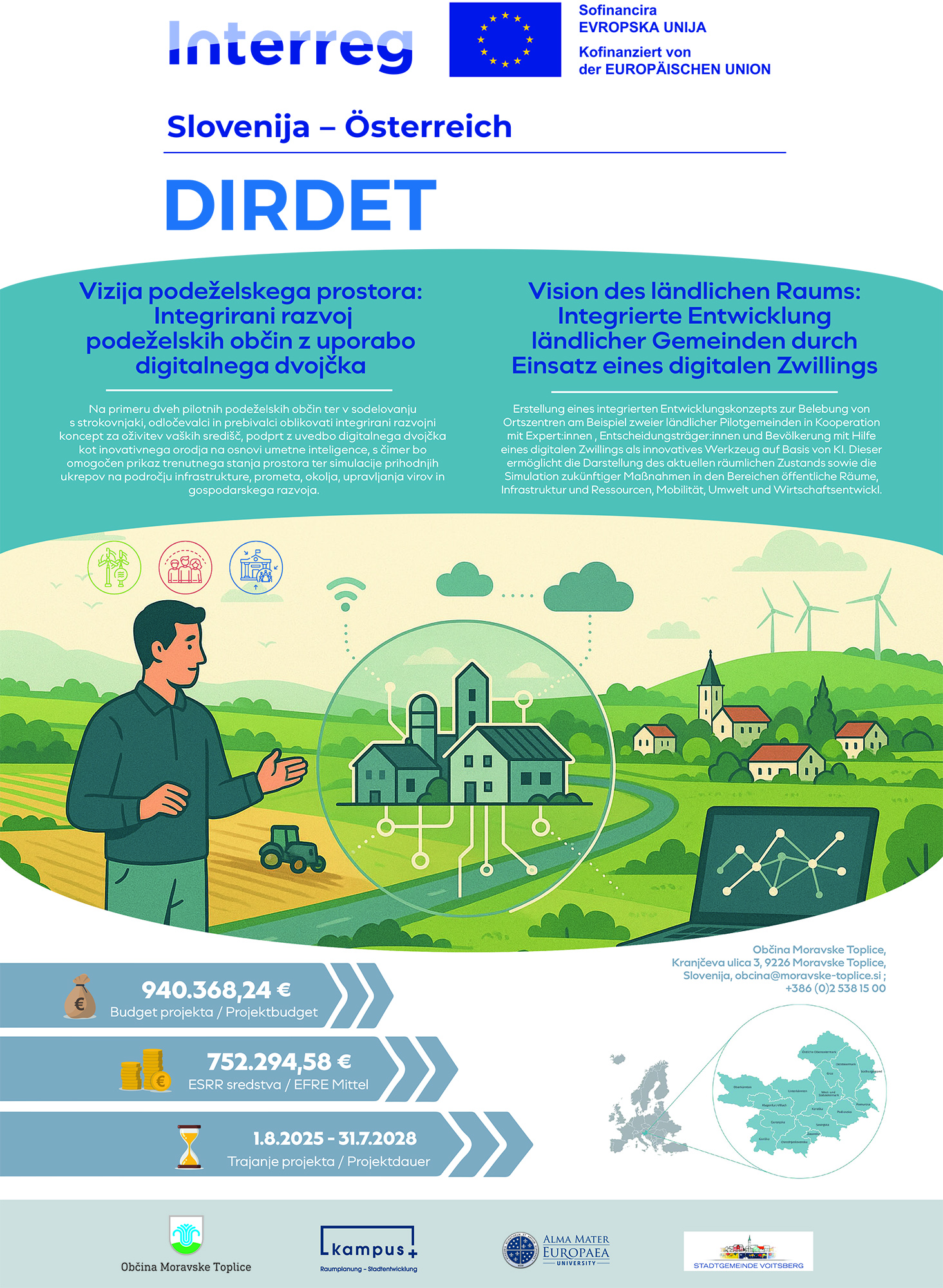 Die Stadtgemeinde Voitsberg hat erfolgreich Fördermittel aus dem Interreg-Programm Slowenien–Österreich 2021–2027 erhalten und ist Partner des strategischen grenzüberschreitenden Projekts DIRDET (digital rural development twin) – Vision für ländliche Räume: Integrierte Entwicklung ländlicher Gemeinden mit Hilfe des Digitalen Zwillings geworden.