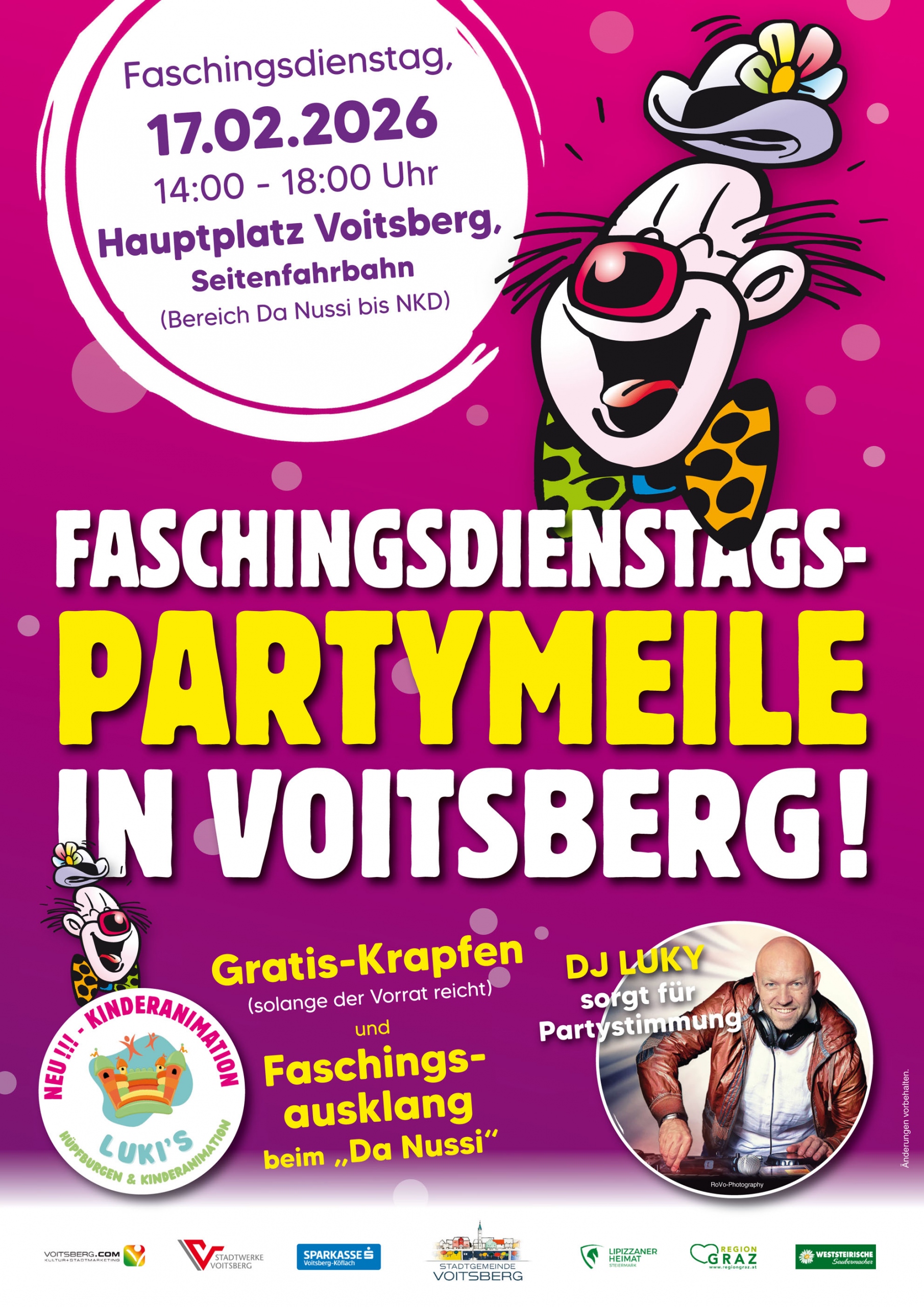 Voitsberg feiert auch heuer wieder den Faschingsdienstag mit einer bunten und fröhlichen Partymeile am Hauptplatz!